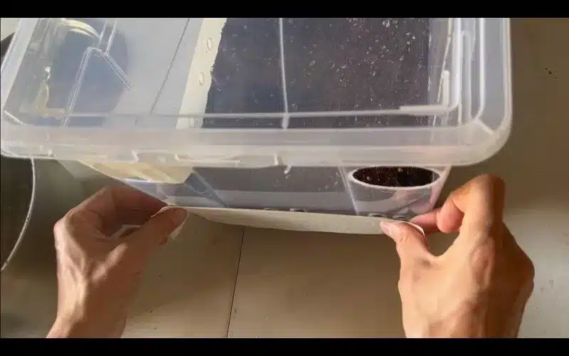 Il faut une ligne de petits trous sur le pourtour de la boite, 2 cm au-dessus de la surface de votre substrat. Celui-ci se trouvera à environ 10 cm de haut, mais vous pouvez ajuster selon la taille de votre boite.